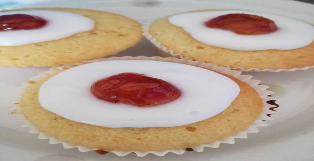 For the Bakewell Cupcakes, I placed a small ball of [amazon_textlink asin=’B00PIQCLC6′ text=’marzipan’ template=’ProductLink’ store=’wwwlovetobake-21′ marketplace=’UK’ link_id=’95917b52-5e7a-11e7-9eba-4de7c1f91359′] on top of a small amount of cake mix then covered it with more cake mix before baking it in the oven. I decorated these cakes with white glacé icing and a half glacé cherry.